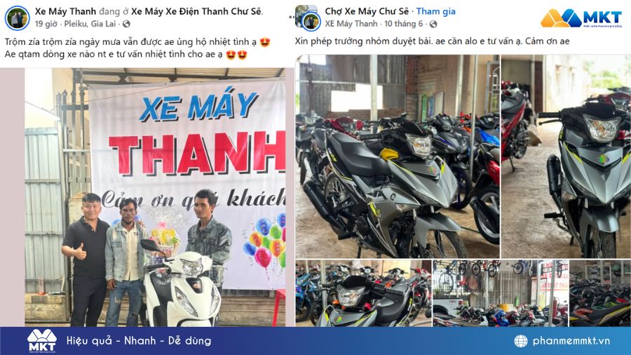 Chia sẻ thêm về cách ứng dụng MKT Care vào hoạt động bán hàng, quảng bá thương hiệu, chủ cửa hàng Xe máy xe điện Thanh Chư Sê chia sẻ: “Tôi nuôi khoảng 10-15 tài khoản Facebook trên MKT Care và dùng các nick này để đăng bài bán hàng trên trang cá nhân và các hội nhóm như: Chợ xe máy Chư Sê, Mua bán xe máy cũ Gia Lai, v.v…Việc đăng bài tự động đem lại hiệu quả rõ rệt, tôi không chỉ tiết kiệm thời gian mà độ phủ thương hiệu cũng cao hơn vì lượng bài đăng gấp 10 lần so với đăng thủ công như trước.