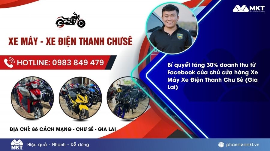 Với sự hỗ trợ từ MKT Care, anh Đình Thanh đã thành công quảng bá thương hiệu cửa hàng Xe Máy Xe Điện Thanh Chư Sê trên Facebook. Đây là minh chứng rõ ràng cho việc áp dụng công nghệ đúng cách có thể tạo ra sự đột phá trong kinh doanh. Thay vì tốn hàng giờ cho công việc thủ công, anh Thanh đã chọn một giải pháp thông minh để tối ưu quy trình, tiếp cận khách hàng hiệu quả và tạo ra tăng trưởng doanh thu bền vững.